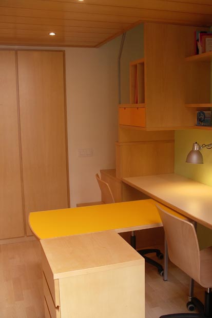 Tarima en dormitorio senior con mesa de estudio para 2, 1 cama + 1 cama nido y escalera con armario.