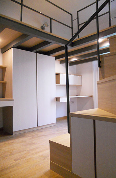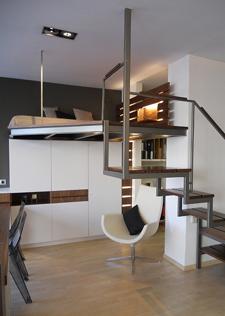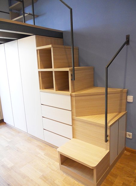 De este modo aprovechamos cada rincón, incluso en la escalera podemos poner armarios y cajones.
