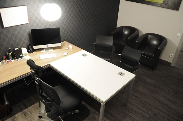 Vam optar per col·locar un paviment de vinil amb un acabat que simula fusta. El paviment de vinil és una solució molt pràctica quan no es vol fer obra ja que es pot col·locar sobre del paviment existent, a més es tracta d'un paviment que té molt poc gruix i és un dels pocs paviments que reduixen considerablement el soroll per l'impacte de les sabates al caminar, per tant és una de les millors opcions per oficines i espais de treball. Es van recobrir les parets amb papers pintats amb textura, per tal de fer més càlides les estances i d'harmonitzar totes les parts del desptax per crear una imatge més corporativa i de conjunt.